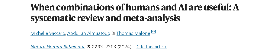 Относительно недавно я прочитал довольно мотивирующую статью в Nature c броским названием про "дополненных и расширенных людей". Расширять и дополнять их (human augmentation) предлагалось конечно же с помощью нейрогенераторов. Под эту задачу провели и соответствующее мета-исследование, посвященное тому, насколько лучше комбинация человек+нейроген справляется с различными задачами по сравнению со standalone человеком и т.н. AI. В результате проведенной работы было установлено, что в среднем комбинация человек+нейроген (в т.н. состоянии синергии) работает эффективнее, чем просто человек. Но такой эффект наблюдается только в случае задач, связанных с генерацией чего-то нового (идей, концептов и проч).