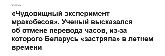 Беларуские власти, эти “черные инноваторы” (о появлении которых я когда-то высказывался), создали уникальный биополитический прецедент. Загнали население в хронобиологические тиски, когда с одной стороны имеет место т.н. “геополитическое время” (жизнь по часам другой столицы), крадущее утренний свет, а с другой - “экономическая шизофрения” (отключение фонарей при наличии чудовищного профицита от АЭС), крадущая вечерний свет. Герберт Уэлс, кажется мне, если бы дожил до новостей из сегодняшней Беларуси, скорее всего положил бы их в основу истории возникновения своих морлоков.